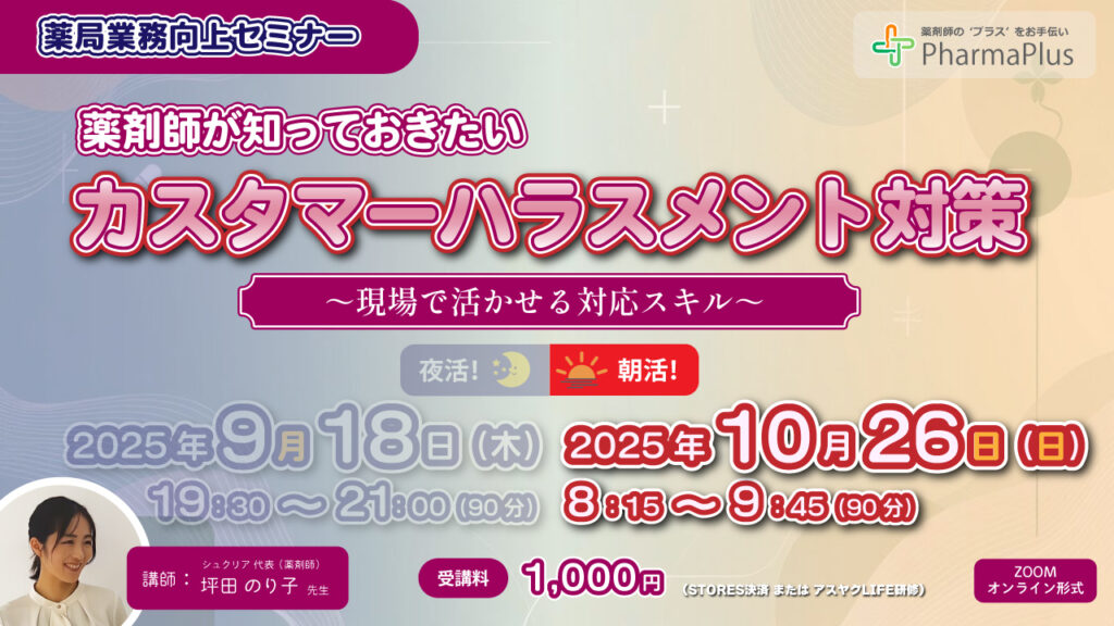 朝活!/ 夜活!「薬剤師が知っておきたいカスタマーハラスメント対策 ~現場で活かせる対応スキル~」【PECS1単位】