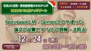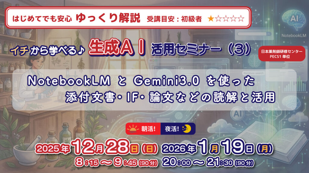 12月28日【朝】・1月19日【夜】 ゆっくり解説!イチから学べる♪ 生成AI活用セミナー(3) ~ NotebookLMとGemini3.0を使った添付文書・IF・論文などの読解と活用 【PECS1単位】