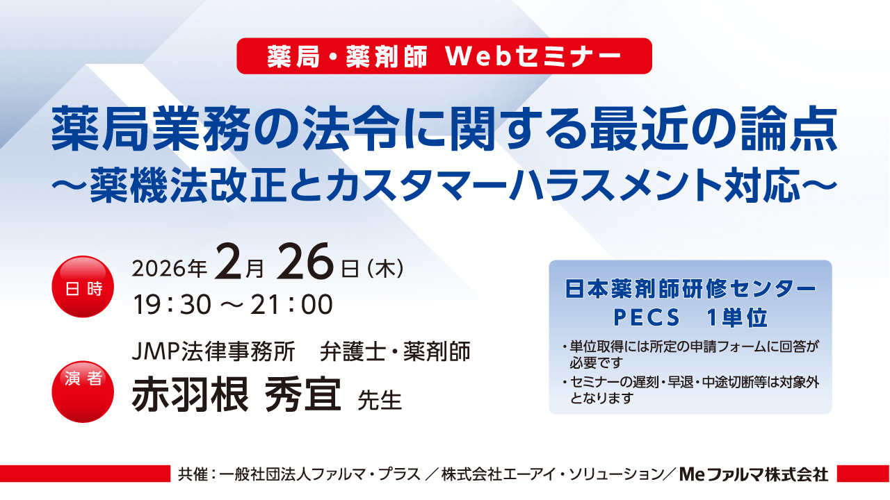 【無料・PECS1単位】2月26日 Web セミナー「薬局業務の法令に関する最近の論点 ~ 薬機法改正とカスタマーハラスメント対応 ~」